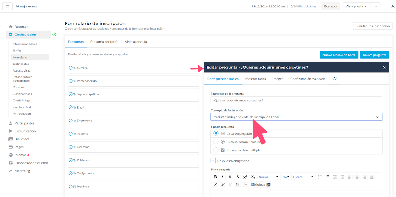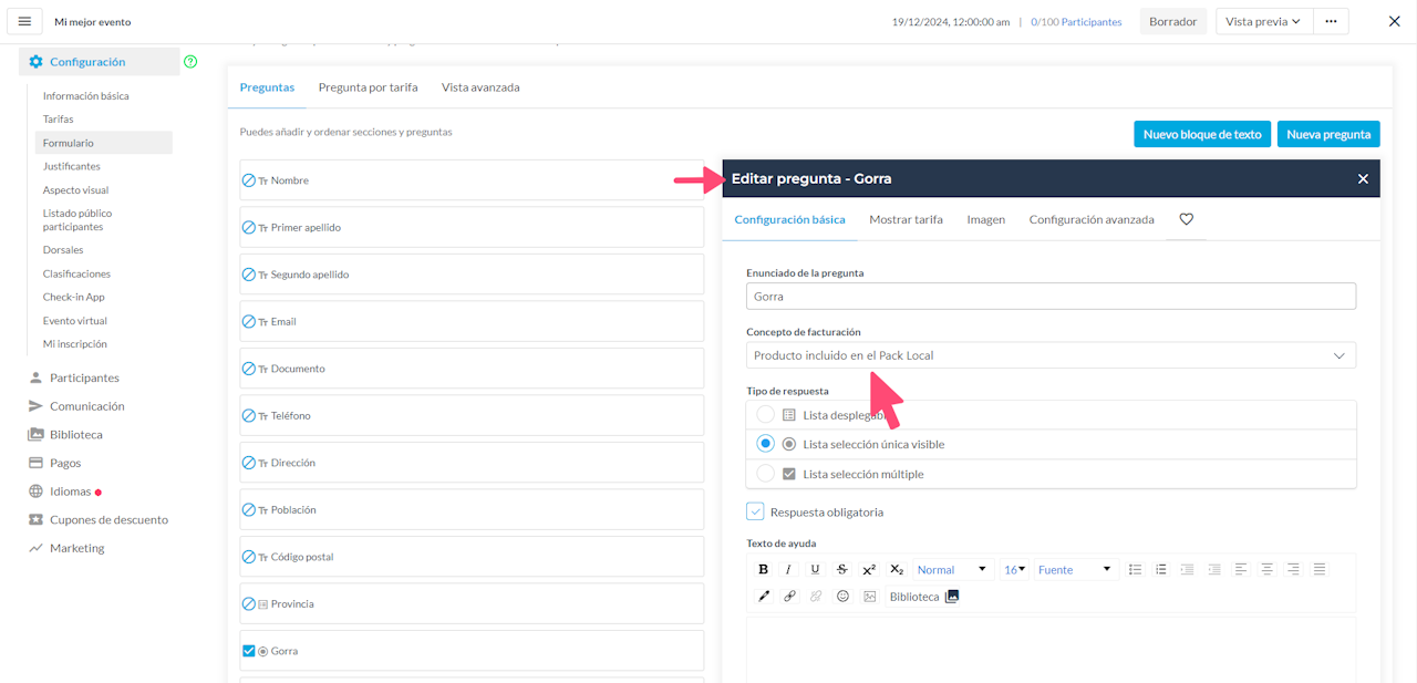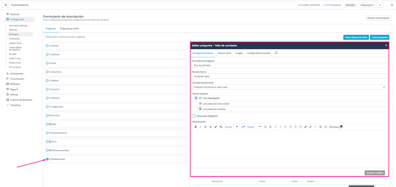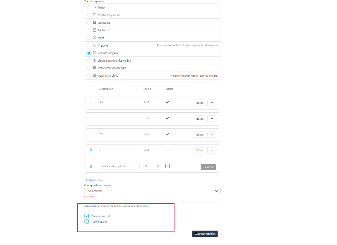 3.Una vez añadido, podremos elegir en qué tarifas queremos que se muestre esa pregunta.