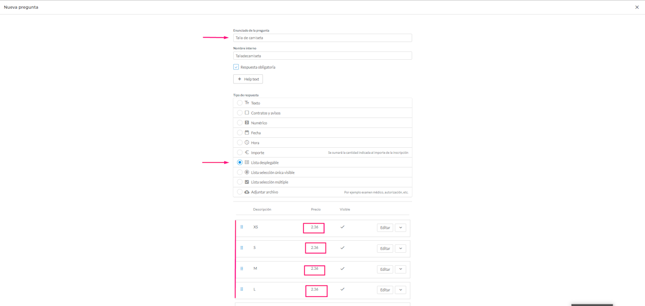 1.Creamos la pregunta desde Configuración-Formulario-Nueva pregunta. Debemos añadir el nombre de la pregunta, el tipo de respuesta así como las tallas que ofreceremos y el precio del producto (precio de venta con IVA incluido) para cada una de las opciones, (Ej: tallas de camiseta que voy a ofrecer).