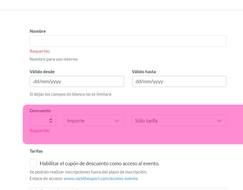 El valor que indiquemos hace referencia a un % de descuento. (Por ejemplo, si configuramos un 100 % de descuento sobre tarifa, significa que la inscripción en el precio de la tarifa le saldrá gratuita.