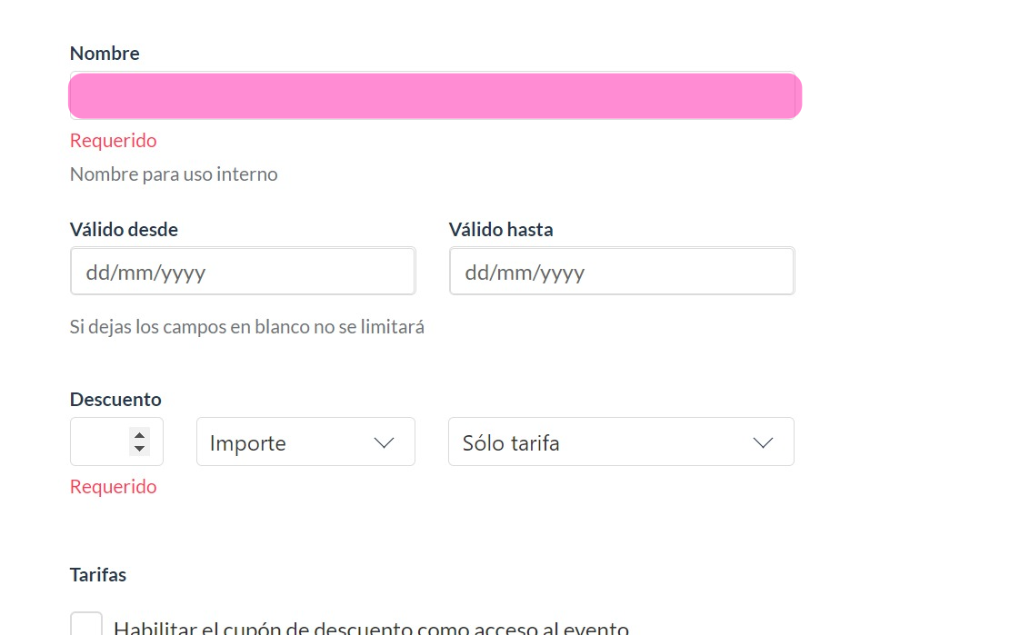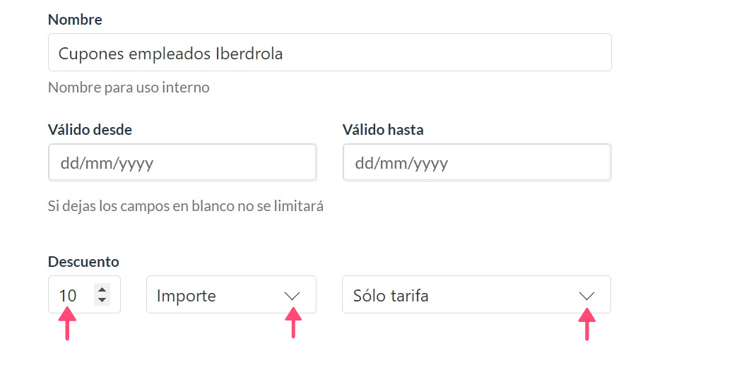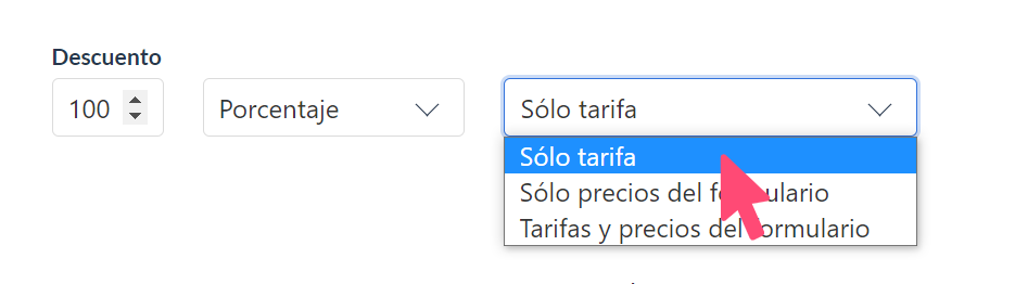 La opción seleccionada hace referencia a qué concepto aplicará el cupón (solo precio de la tarifa, solo a precios del formulario, a ambos conceptos).