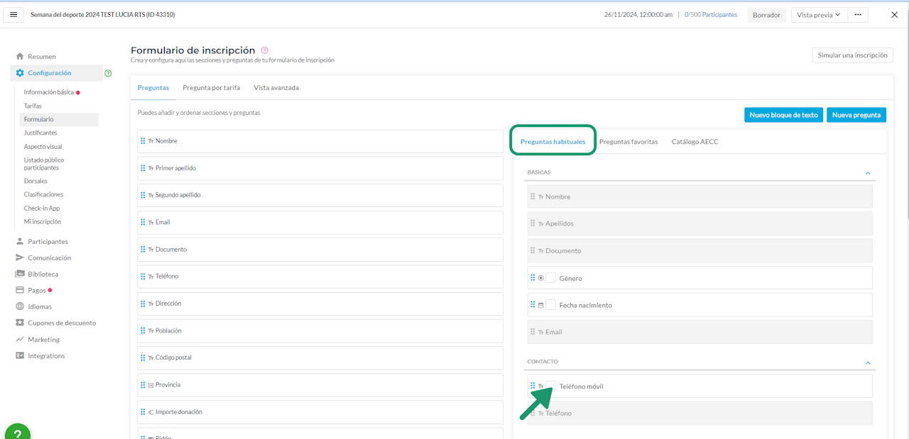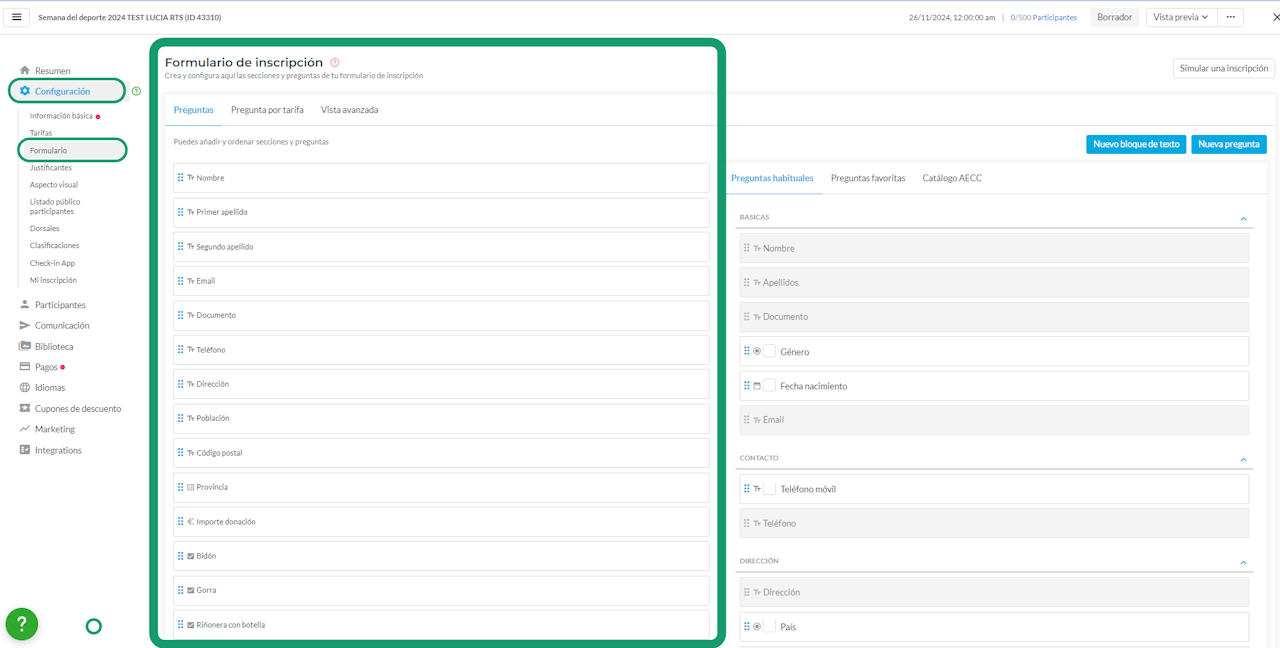 En todos los eventos AECC ya están añadidas por defecto las preguntas que deben mostrarse en el formulario.