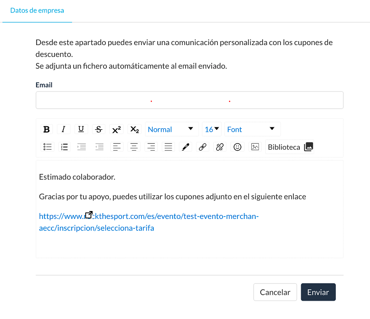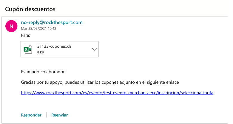 El cuerpo del mensaje se puede personalizar. Recomendamos no borrar la dirección web propuesta por defecto para facilitar las inscripciones. El sistema adjuntará automáticamente un fichero con los cupones creados.