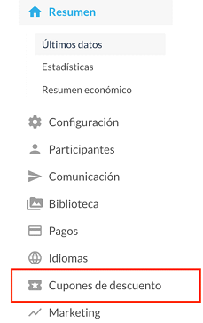 Como ya hemos visto, una vez dentro del administrador y seleccionado el evento, accedemos al menú “Cupones de descuento”.