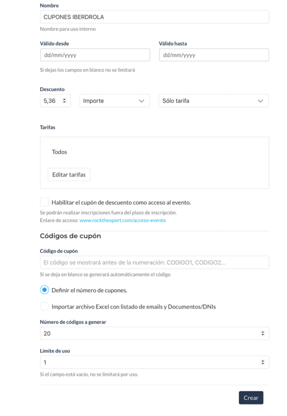 - Indicar un número de cupones a crear y el número de veces que se puede utilizar en cada caso.
