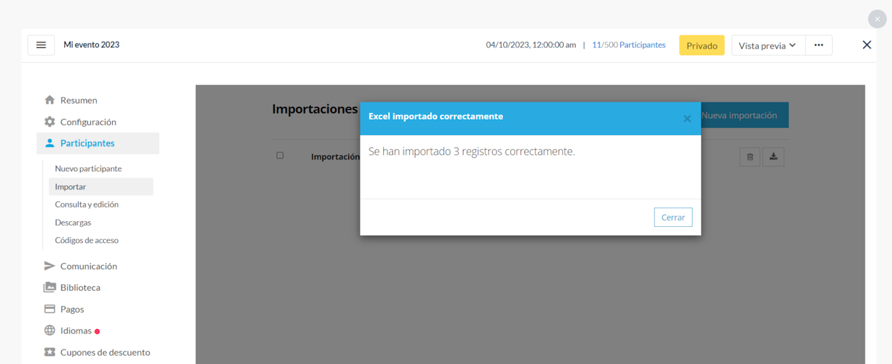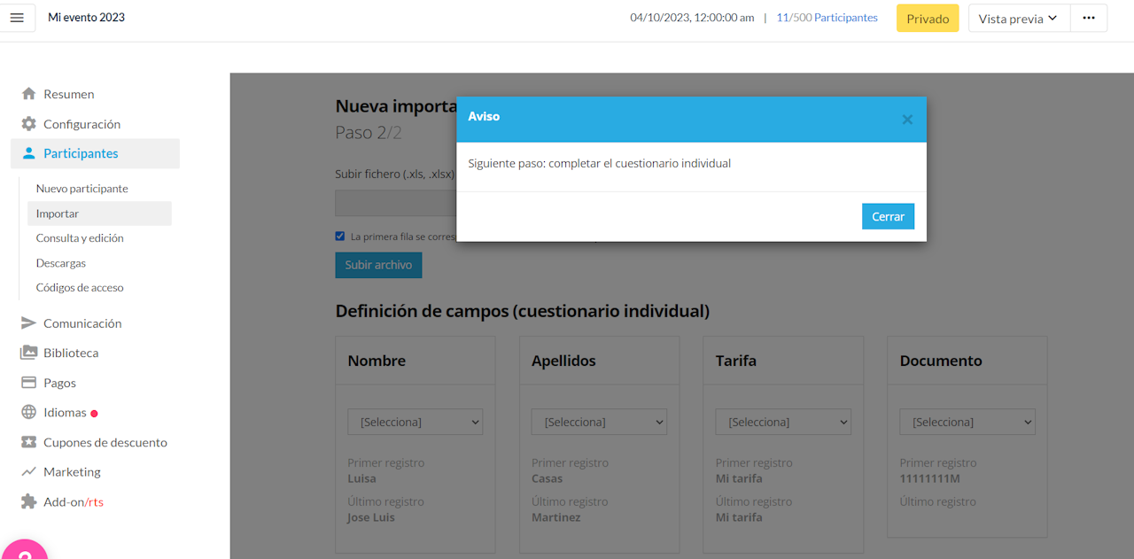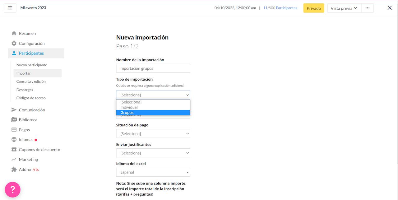 Se importará una excel por cada modalidad/ tarifa del evento. Ej: si en mi evento hay dos tarifas realizaré dos importaciones por separado.