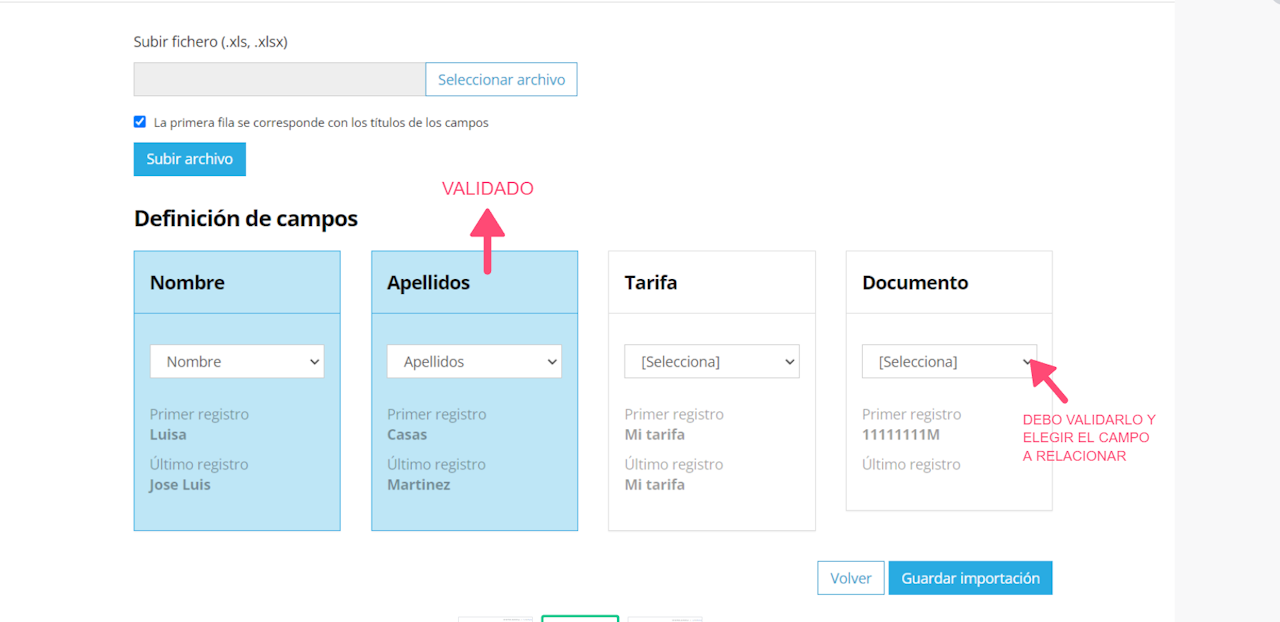 - El sistema automáticamente relacionará todos los campos de la Excel con los de nuestro formulario o sabrás porque el recuadro correspondiente está en color azul.