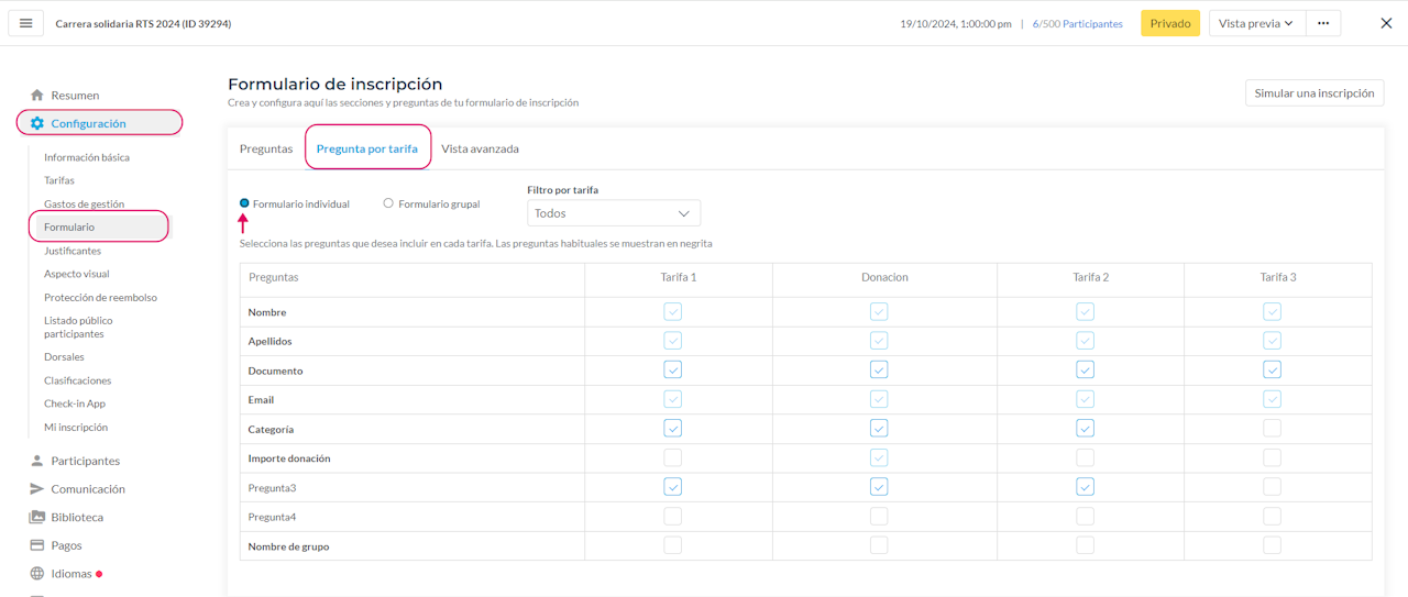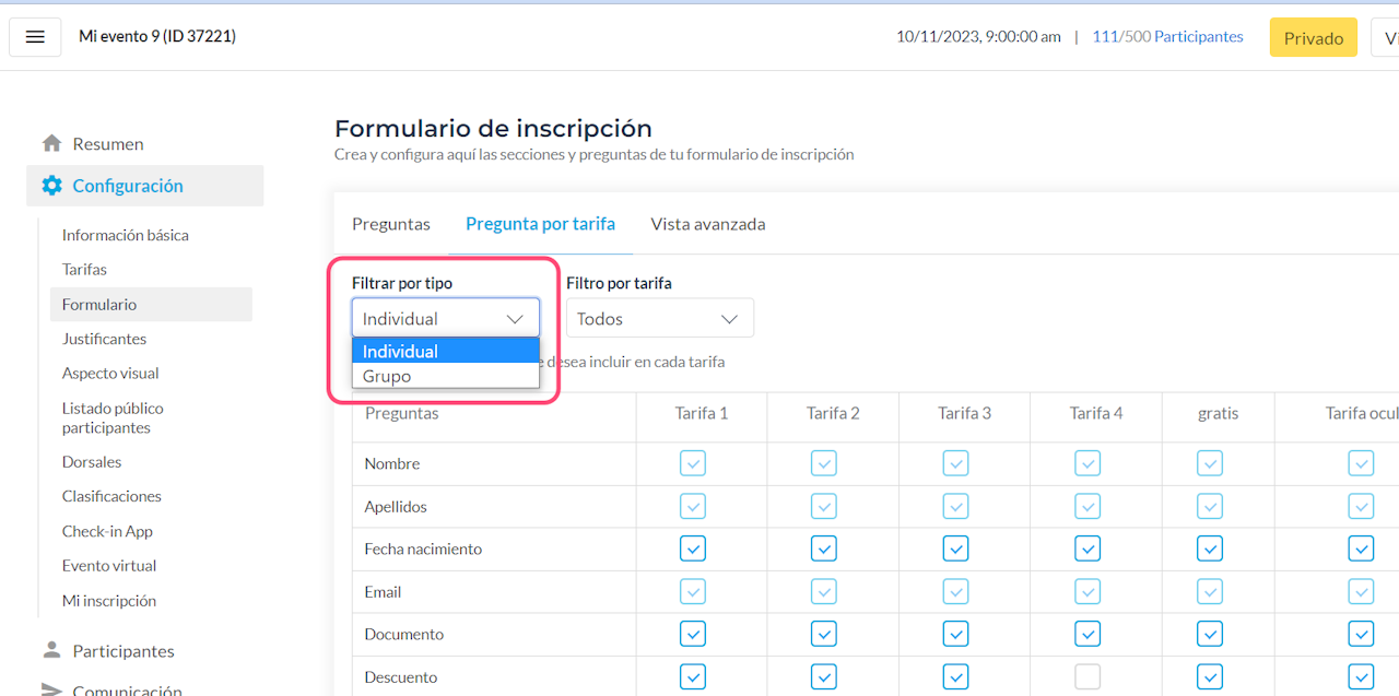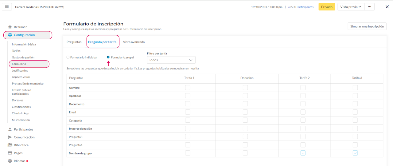 Si clicamos en "formulario grupo" nos aparecerán las preguntas grupales visibles o no en las tarifas de grupo.