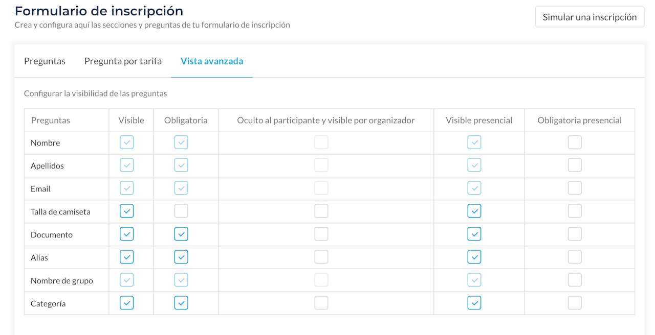 - Oculto al participante y visible por organizador: solo es visible por ti, el usuario no la va a ver públicamente. (Para que se descargue e en el formulario Excel debe estar marcada además como "Visible").