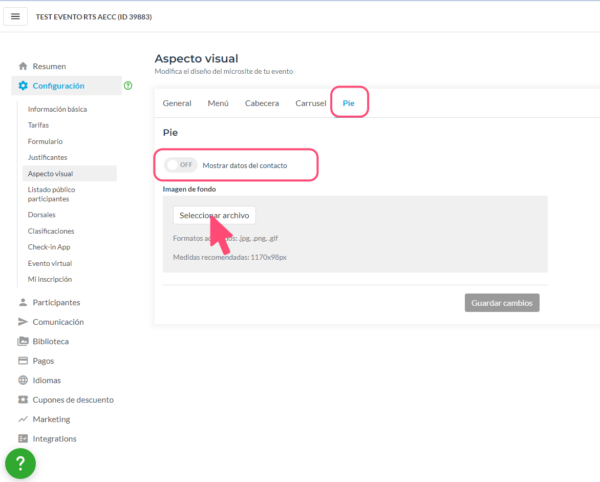 Subir imagen de fondo: podrás subir en este apartado una imagen de fondo en el Pie de página del Microsite.