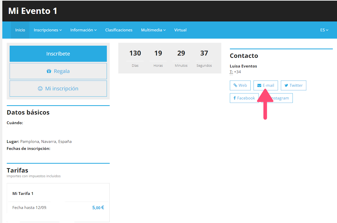 En pestaña Contacto deberás configurar los datos de contacto del evento. (Datos que saldrán públicos para que el usuario pueda contactar contigo.