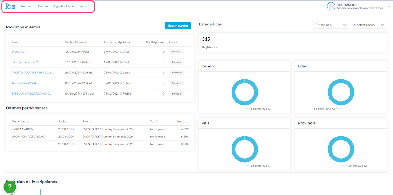 Un menú en la parte superior y una serie de gráficos que muestran algunas estadísticas globales de todos tus eventos.