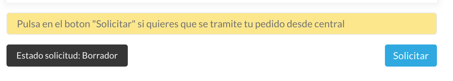 Estas solicitudes ya se podrán tramitar desde la central. Puedes volver al estado borrador para modificarla siempre y cuando no se haya tramitado en un pedido de central.