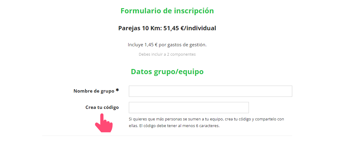 Automáticamente cada vez que un grupo se vaya a inscribir les dará la opción de poner un código para poder añadir más componentes (ver imagen 2).