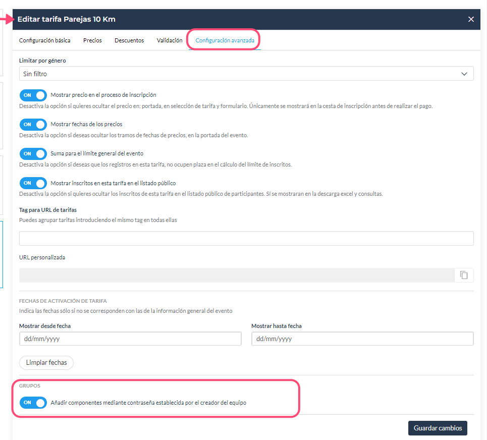 Para ello debes de ir a editar la tarifa y en Configuración avanzada, activar la opción correspondiente "Añadir componentes mediante contraseña establecida por el creador del equipo" (ver imagen 1).