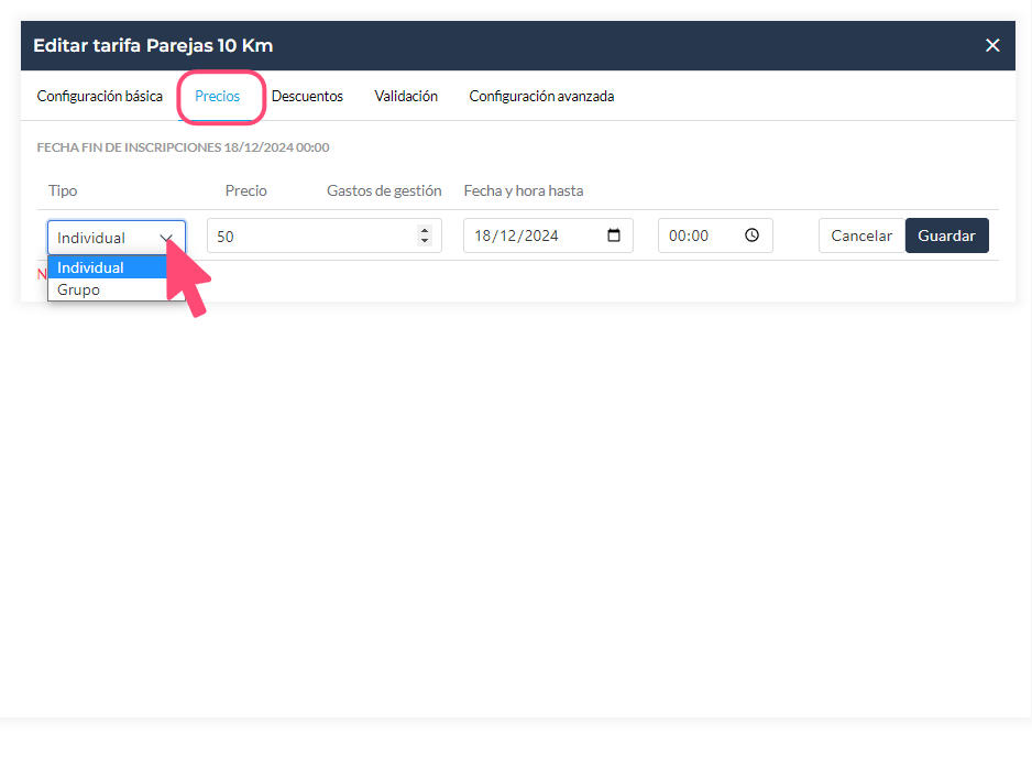 Las tarifas grupos se crean cuando en nuestro evento va a haber una modalidad de parejas, relevos, grupos.