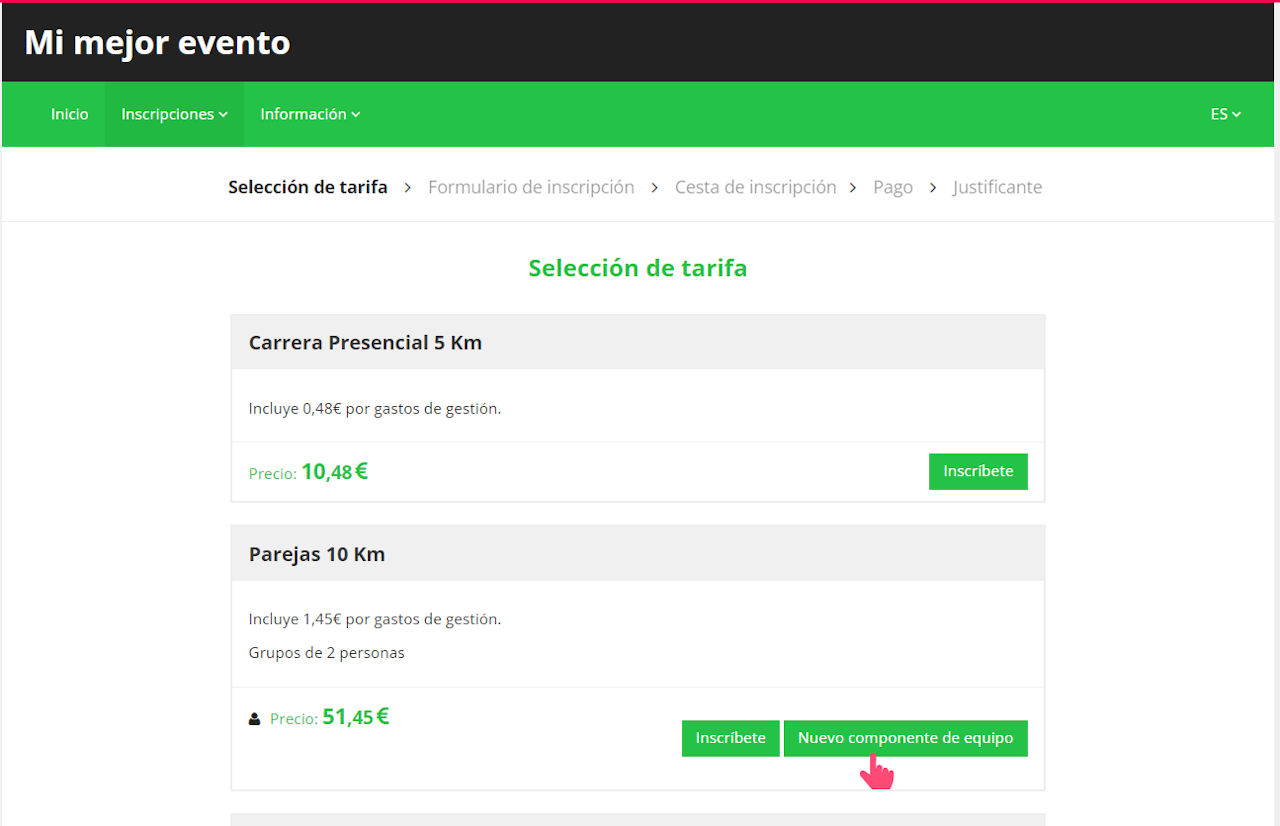 Cuando el nuevo componente quiera inscribirse dentro de ese grupo irá a la web del evento, tarifa correspondiente y pulsará en "Nuevo componente de equipo". (ver imagen 3)